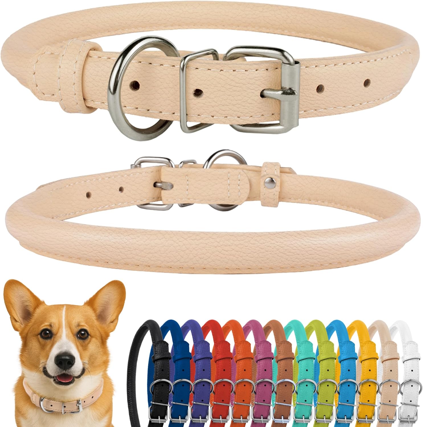 CollarDirect Rolled Leather Dog Collar, Soft Padded Round Puppy Collar, Handmade Genuine Leather Collar Dog Small Large Cat Collars 13 Colors (13-16 Inch, Beige Textured)