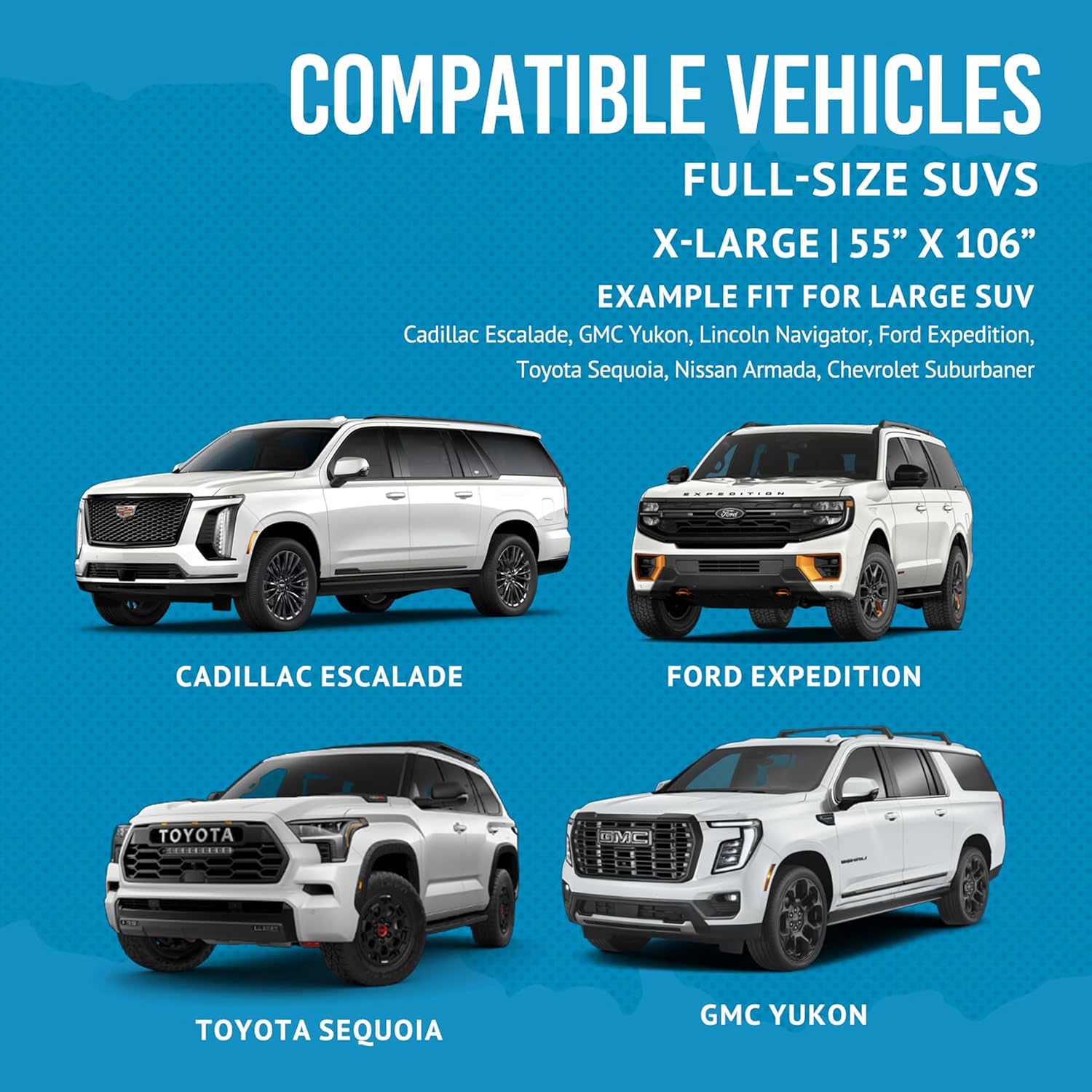 - Versatile Fit: Universal fit and unique design cargo & trunk liner measuring at ( 55" x 106" ) inches. DOES NOT EXTEND FULLY UP TO THE WINDOWSâSEE IMAGES AND MEASUREMENTS FOR ACCURATE COVERAGE DETAILS. Bulldogology designed pet cargo seat covers to install and remove in under 30 seconds. Secure the covers with easy to use durable headrest adjustable straps, keep covers in place with moisture protection non-slip silicon backing. Each feature was manufactured for ease of use and added versatility.