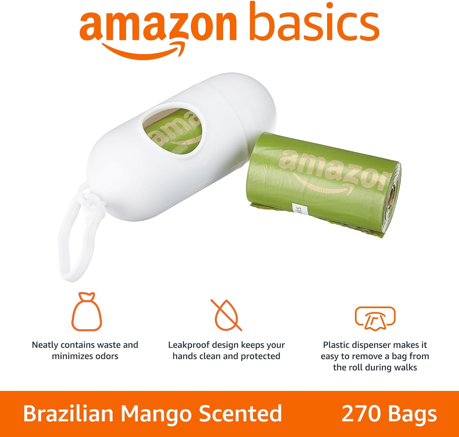 Amazon Basics Dog Poop Bags with Dispenser, 270 Count, Enhanced for Guaranteed Leakproof, Brazilian Mango Scented, Includes Leash Clip