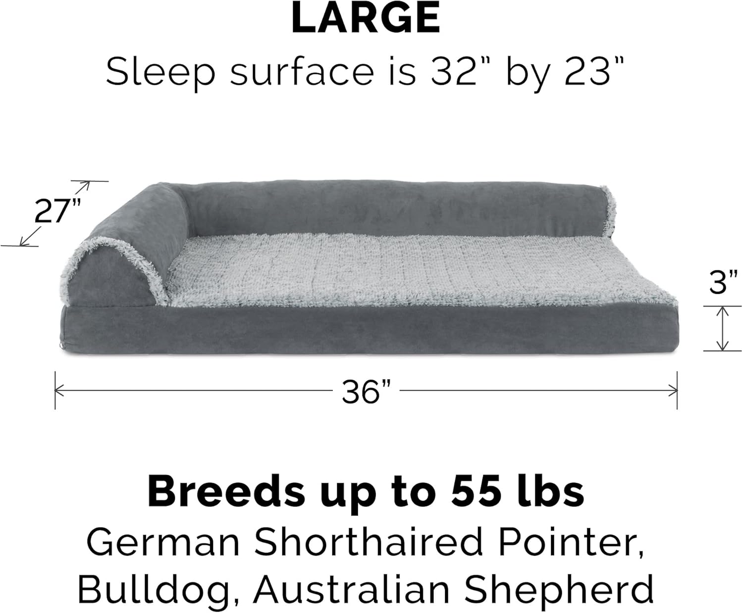 Furhaven Cooling Gel Dog Bed for Large/Medium Dogs w/ Removable Bolsters & Washable Cover, For Dogs Up to 55 lbs - Two-Tone Plush Faux Fur & Suede L Shaped Chaise - Stone Gray, Large