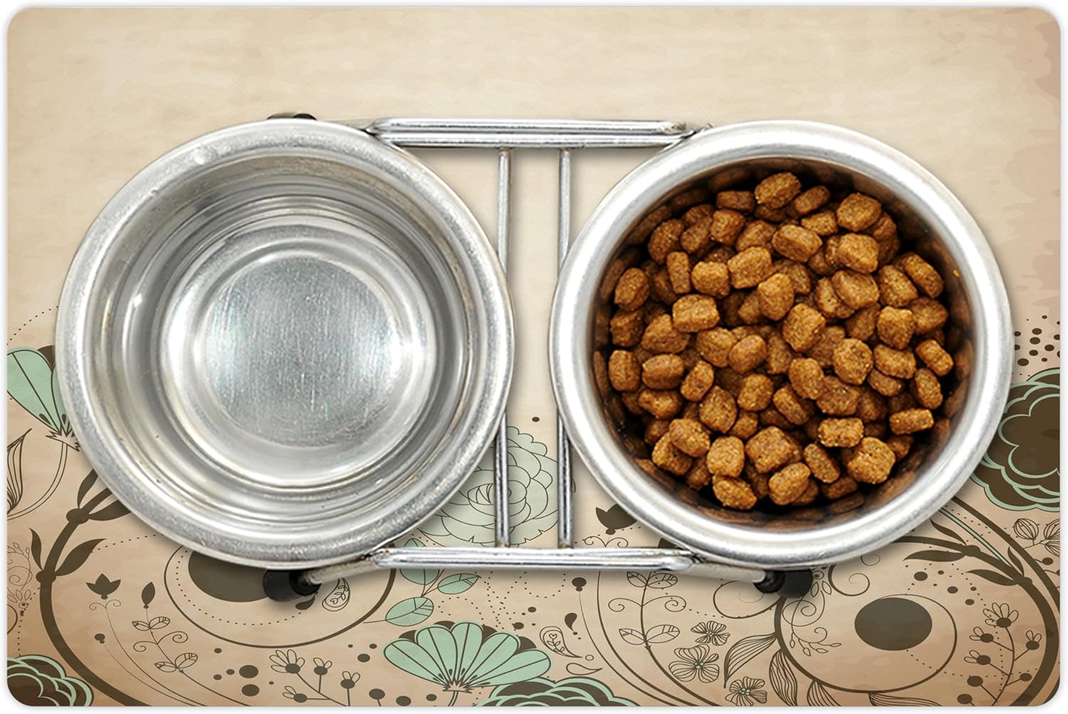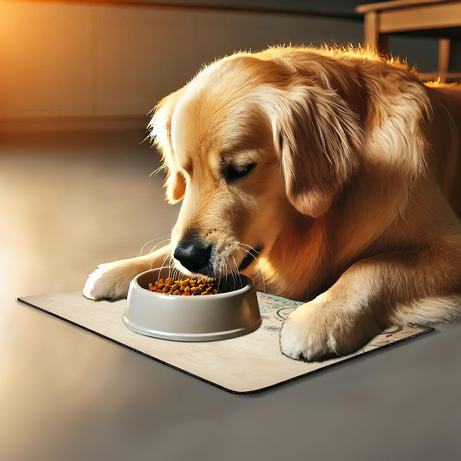 - Features - Fun prints and long-lasting colors. Find any theme and color you want to match your room decor or your petâs personality. This pet feeding mat can even feature your cat's or dogâs favorite item or design, adding a cheerful touch to your petâs feeding area.