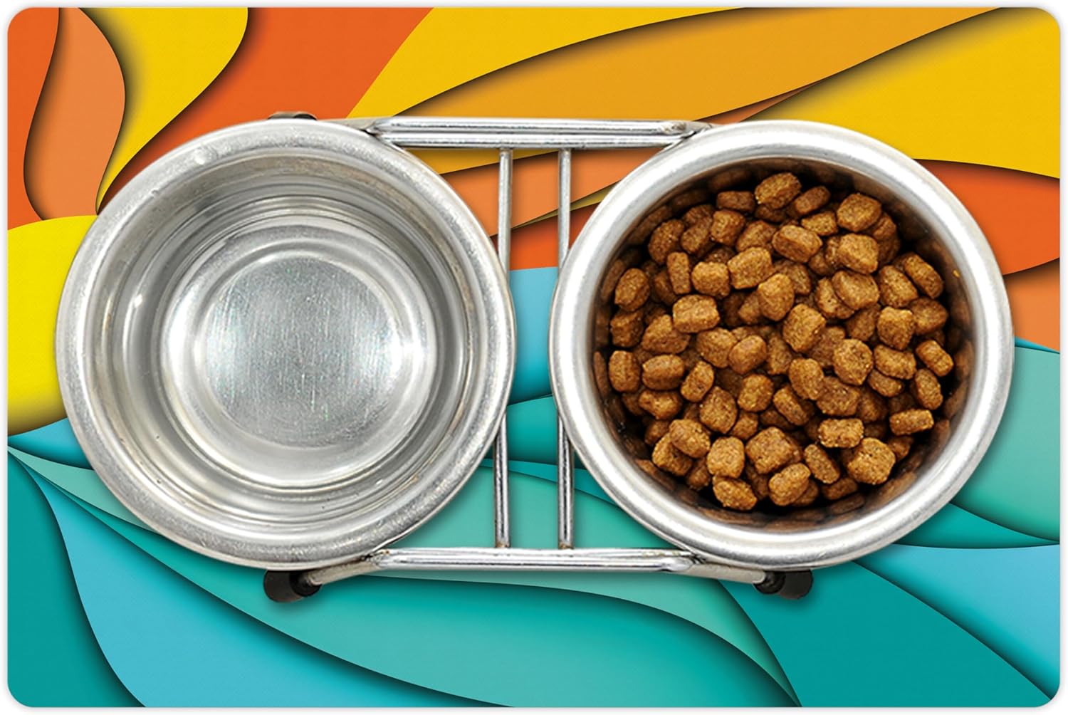 Lunarable Sun Pet Mat for Food and Water, Abstract Sunset and Sunrise Concept Ocean Sea Waves Backdrop, Non-Slip Rubber Mat for Dogs and Cats, 18" X 12", Turquoise Orange