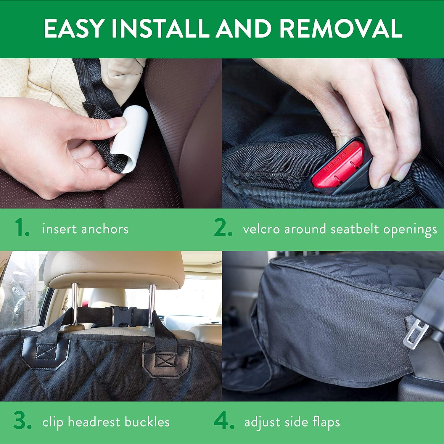 - đđđŚđŹ đ§đ˘ đđĄđŚđ§đđđ: This back seat car cover comes in various sizes, REGULAR - 55''W X 60''L / EXTRA LARGE - 63''W X 68''L / BOTH HAVE - 9'' X 18'' SIDE FLAPS. This elastic skirt and adjustable back and headrest straps provide a seamless clean look and snug fit. Buckle the dog car seat protector to your back seat using the adjustable back strap and insert the seat anchors to secure the cover in place. The headrest strap fits most vehicles