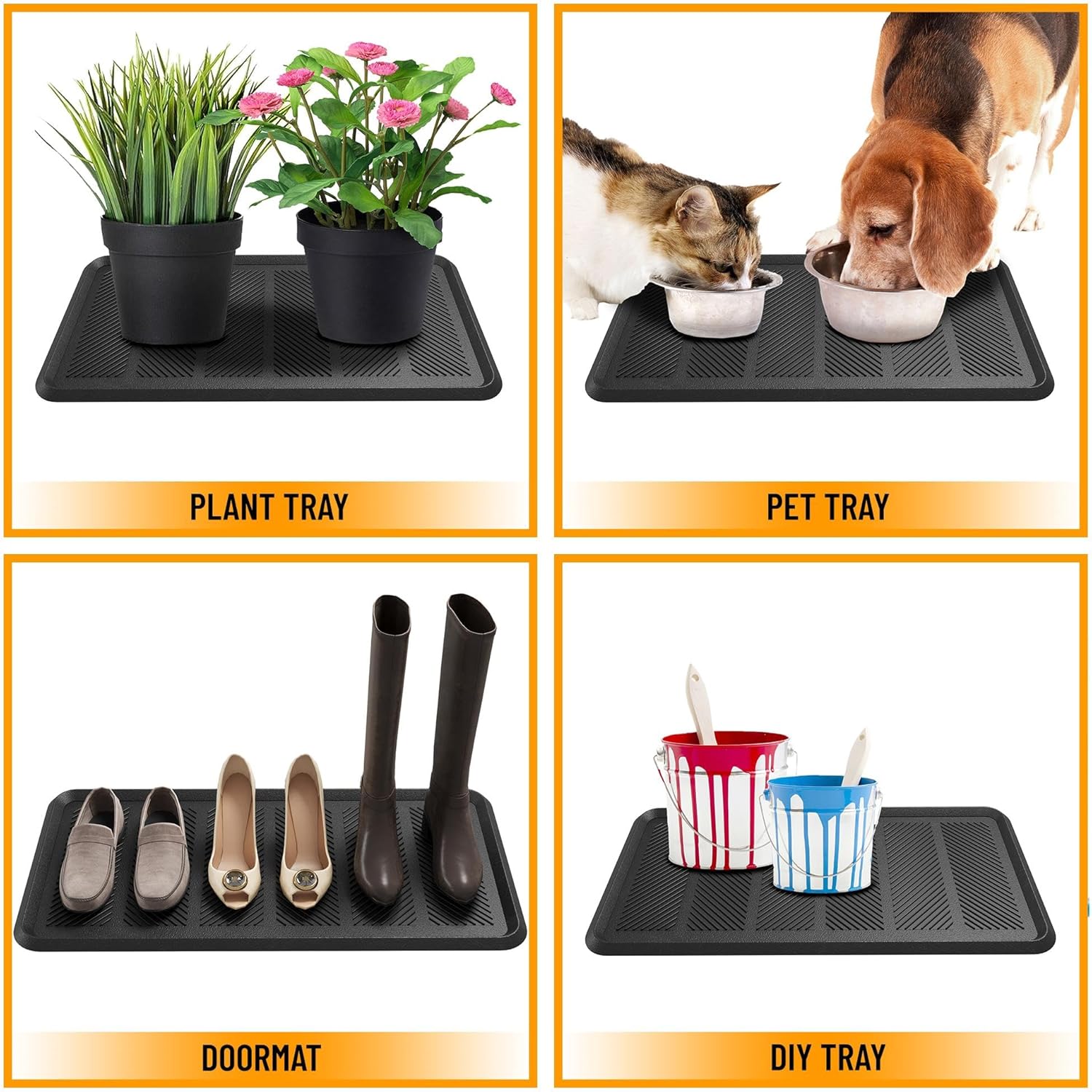- [RECOMMENDED USE]: This boot tray can be utilized as a mud mat for shoes, and doormat for indoor and out door areas such as entryway, doorway, patio, garage, mud room, deck, sunroom, basement, or porch.