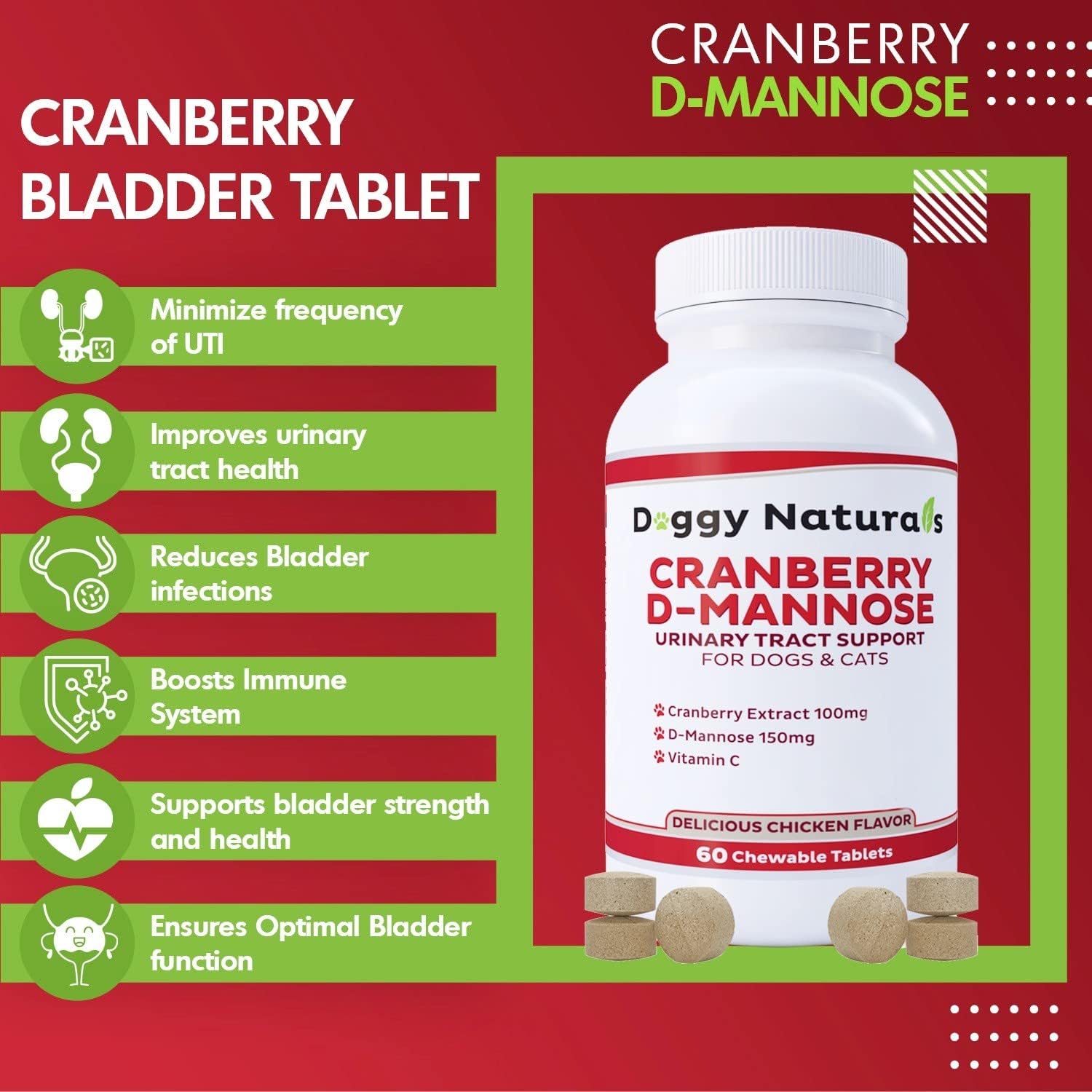 - ❤️Doggy Naturals Cranberry D-Mannose delicious chicken liver chewable tablets are recommended for dogs and cats with urinary tract infection that contains substance known to benefit pet’s urinary tract and help pets to improve UT wellness