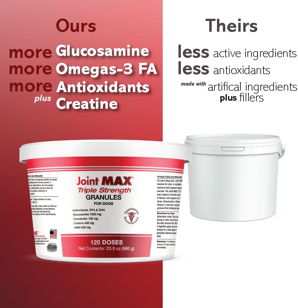 - RELIEF FROM INFLAMMATION - For active dogs or once active dogs that still love to play, Joint MAX Triple Strength uses natural turmeric root to reduce inflammation and relieve joint pain. Your pet will finally rest comfortably after a rough day at the dog park with our super joint enhancer.