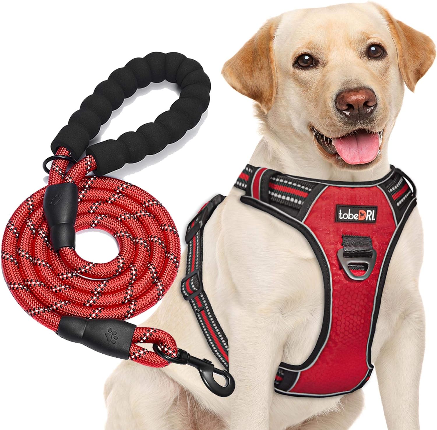 No Pull Dog Harness Adjustable Reflective Oxford Easy Control Medium Large Dog Harness with A Free Heavy Duty 5ft Dog Leash (S (Neck: 14"-17", Chest: 18"-21"), Red Harness+Leash)