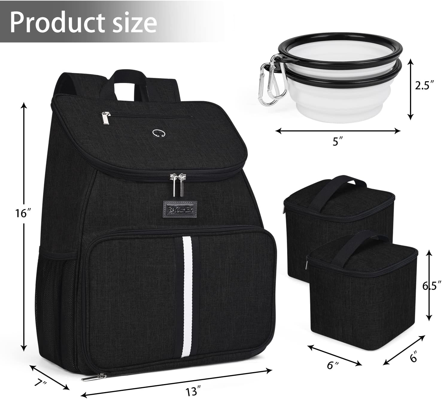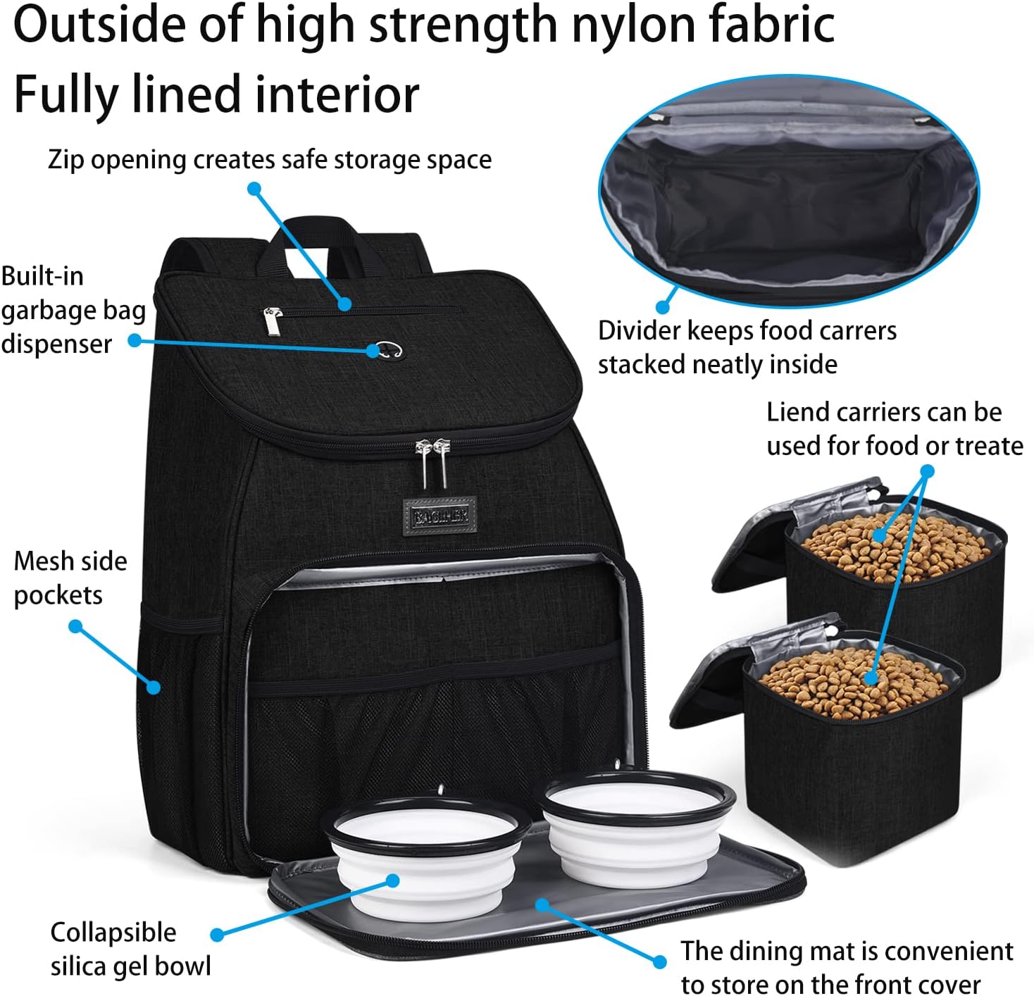 BAGLHER丨Dog Travel Bag, Airline Approved Pet Supplies Backpack, Dog Travel Backpack Accessories Set with 2 Silicone Collapsible Bowls and 2 Food Baskets. Black