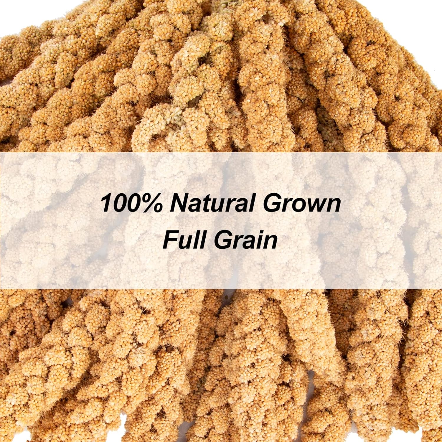 - TASTY PLUMP & HEALTHY -- Our spray millet for parakeets is hand-harvested, hand-graded, hand-packed, without using any mechanical equipment in the process. It's Non-GMO, No Additives, containing vitamins and proteins, supplement nutrition for your pets and make your pets More Healthier. Rich in coarse fiber, it also helps young pets grind their teeth.