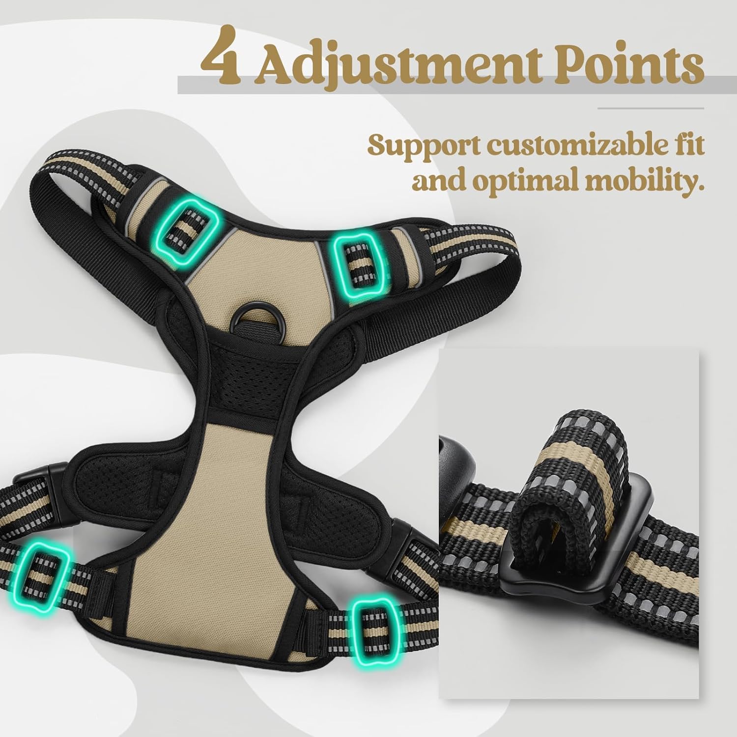 - Fully Adjustable - This adjustable harness features 4 easy adjusting straps around the body. You can use its 2 neck straps and 2 chest straps to create a perfect fit for your dog with some room of growth. No worries about slipping out or choking