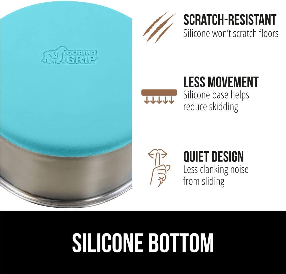 - SILICONE BOTTOM: the Gorilla Grip bowl is constructed from durable silicone that helps keep the bowl steady and wonât scratch your floors; while some over eager eaters may still be able to slide the bowls, the silicone will help prevent much movement; plus, it reduces the noise from clanking and sliding across wood, tile, and more