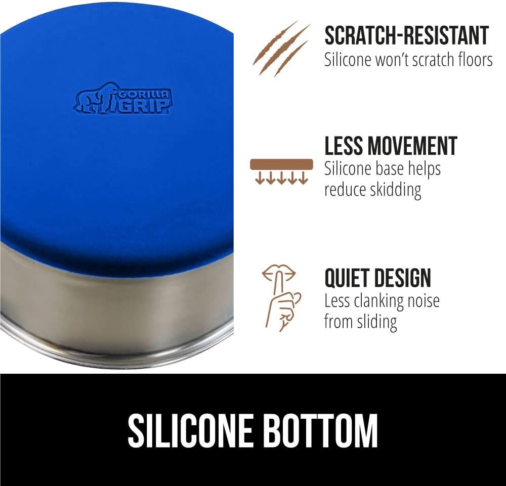 - SILICONE BOTTOM: the Gorilla Grip bowl is constructed from durable silicone that helps keep the bowl steady and wonât scratch your floors; while some over eager eaters may still be able to slide the bowls, the silicone will help prevent much movement; plus, it reduces the noise from clanking and sliding across wood, tile, and more