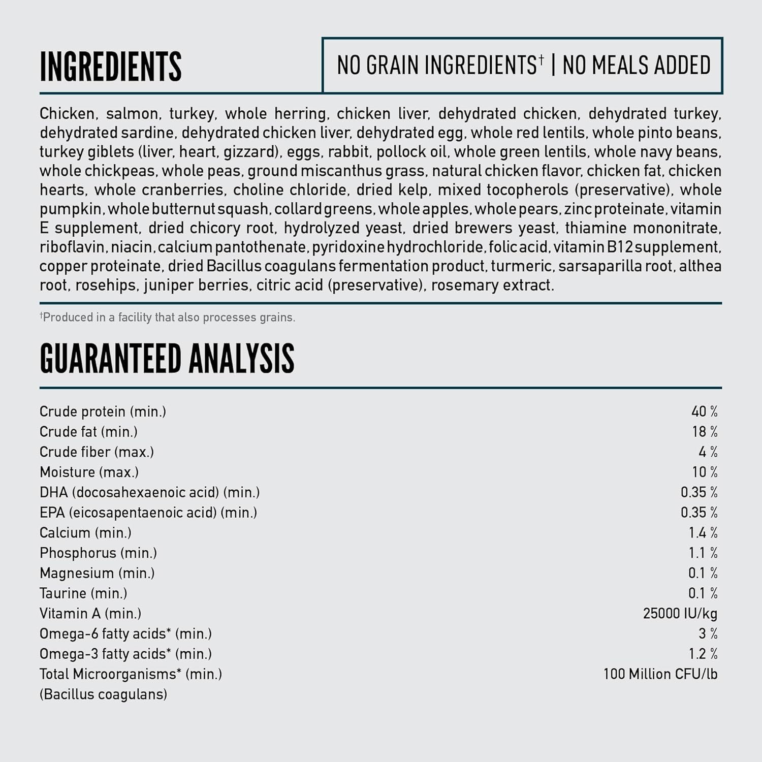 - Grain free dry cat food** containing 90 percent*** animal ingredients, including organ and bone WholePrey ingredients to mimic what your cat's ancestors consumed in the wild