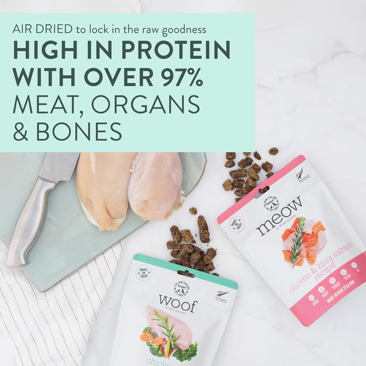 - Ethical & Sustainable - Made in small batches in New Zealand using premium freeze dried Salmon & Chicken combined with organs, ground bones, & other natural, nutritious ingredients.