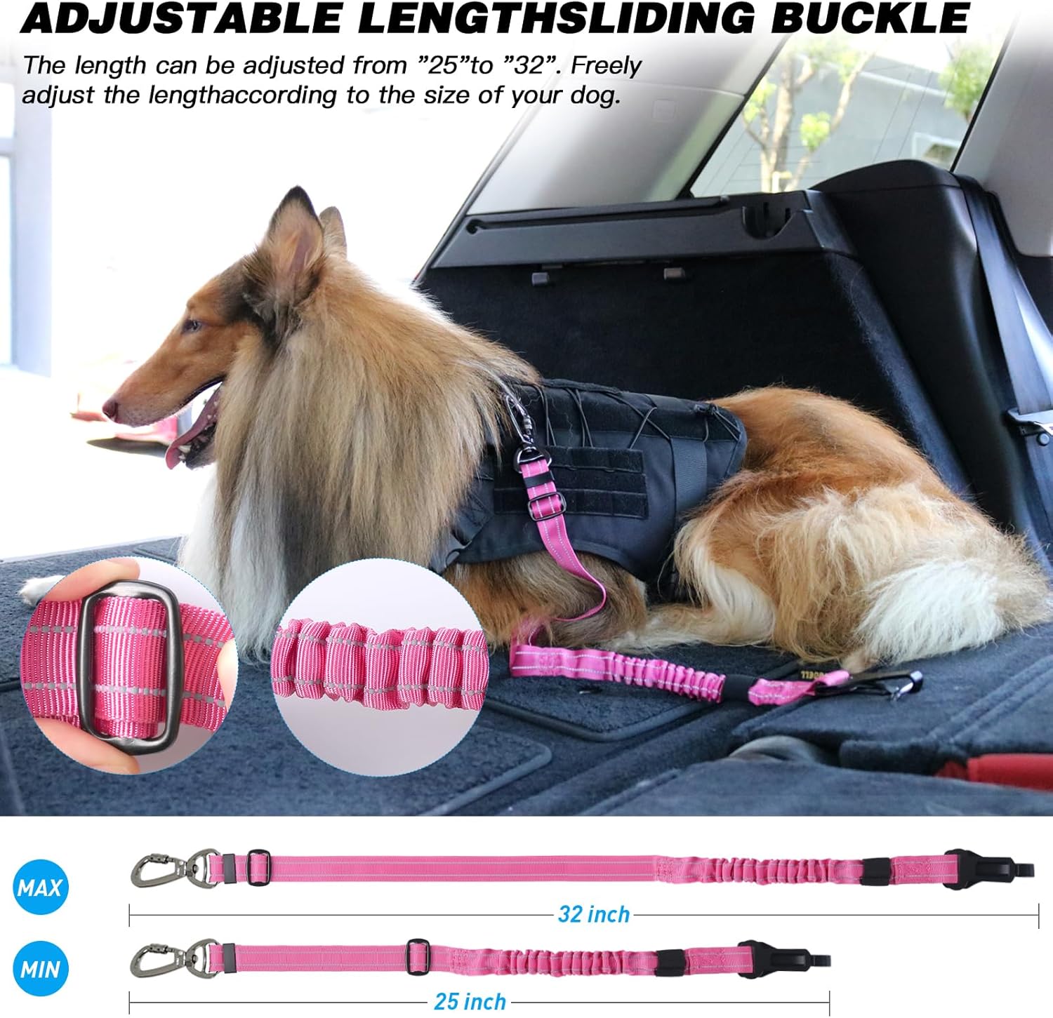 - Elastic Buffer Design - AUBELL dog seatbelt top rope is made of High-quality bandages, strong elasticity can protect dogs from sudden braking or sharp turns. It can be adjusted from 25" to 32"
