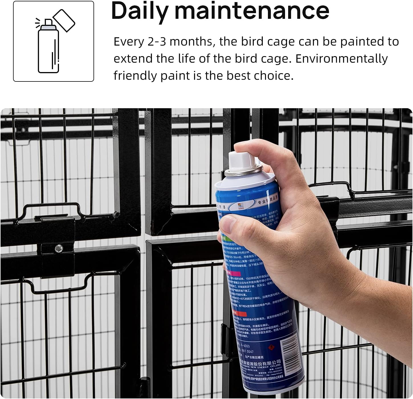 - Security - Welded stainless steel coated with a non-toxic powdered finish avoids birds' chewing & Suitable bar space prevents the risk of birdâs escaping.