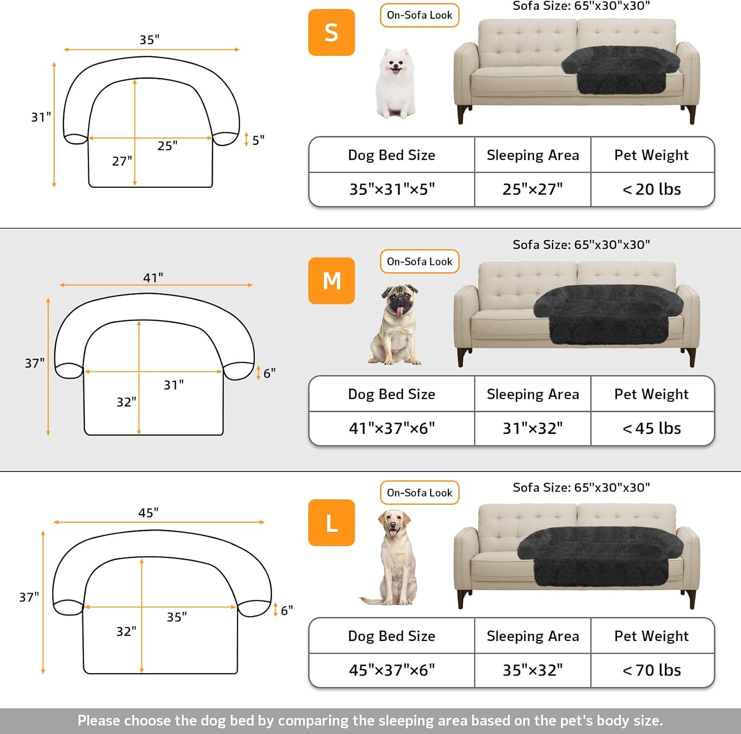 - 【Multiple Size Selection】The couch pet bed has 5 sizes for you to choose from. XS: 31"x23.5" dog bed for small pets. S: 35“x31" dog bed for cats and small dogs. M: 41”x37" dog bed for medium dogs. L: 45“x37" dog bed for large dogs. XL:53"x39" dog bed for large dogs. We have enlarged the sleeping area for pets to give dogs more space.