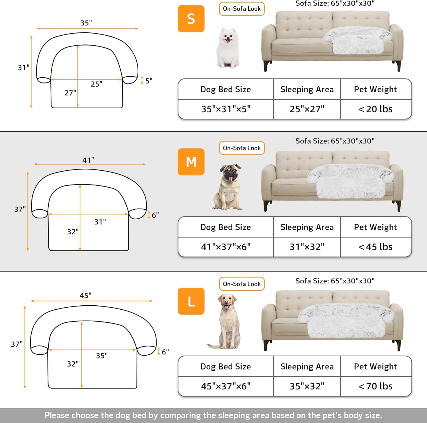 - 【Multiple Size Selection】The couch pet bed has 5 sizes for you to choose from. XS: 31"x23.5" dog bed for small pets. S: 35“x31" dog bed for cats and small dogs. M: 41”x37" dog bed for medium dogs. L: 45“x37" dog bed for large dogs. XL:53"x39" dog bed for large dogs. We have enlarged the sleeping area for pets to give dogs more space.