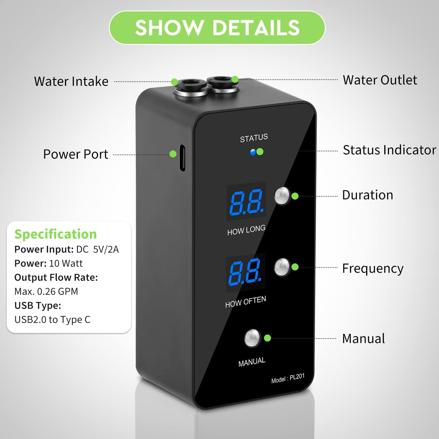 - Timer Function: Only 3 buttons to set up, and you can set a timer of up to 5 minutes spraying time, and 1H to 30-Day misting frequency. No worry about your pets when you are going out for days.