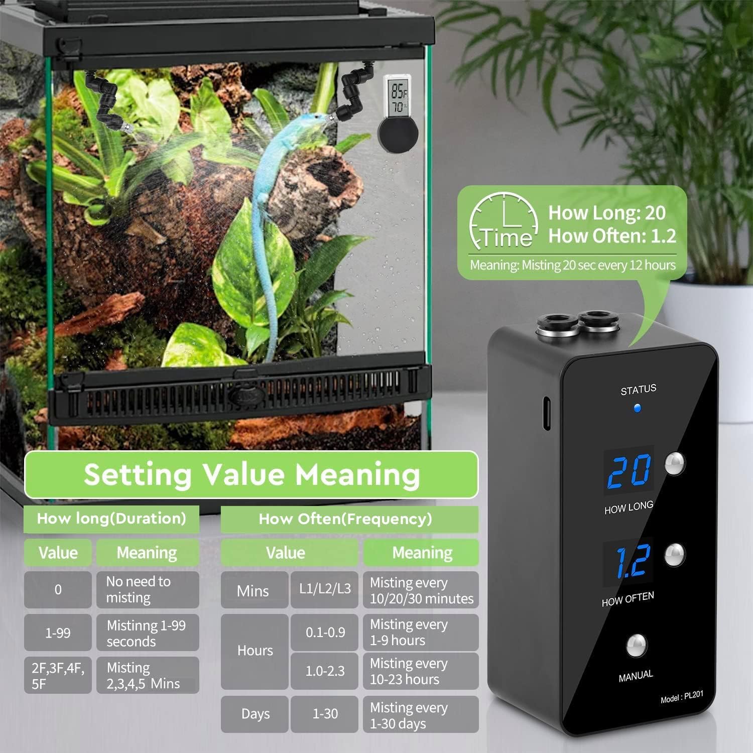 - High-Density Misting Effect & 360° Rotation Nozzles: Compared to the traditional reptile fogger, the misting system increases humidity effectively and rapidly. By rotating the 2 misting nozzles, you can make the misting cover every corner of your reptile terrariums.