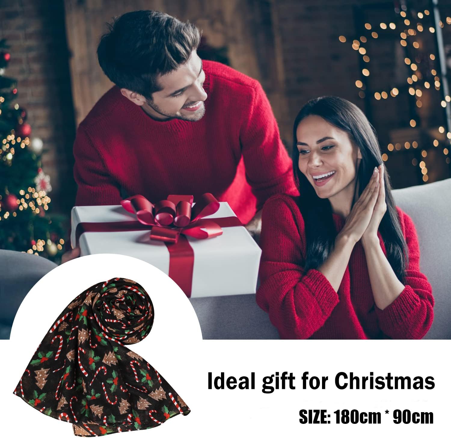 - Size: 180cm*90cm /70.9â * 35.4â. Xmas scarfs is large enough to be wrapped around or draped over the shoulders in a variety of ways. With a light texture, Scarf with Christmas Print is easy to carry around and can easily fit into a bag.