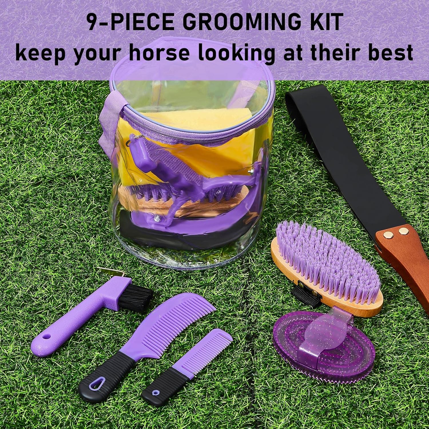 9 Pieces Horse Grooming Kit Tack Room Supplies Set with Organizer Tote Bag, Oval Massage Curry, Hard and Soft Brush, Hoof Pick, Sweat Scraper, Bathing Sponge, Combs for Horse Riders Beginners (Purple)