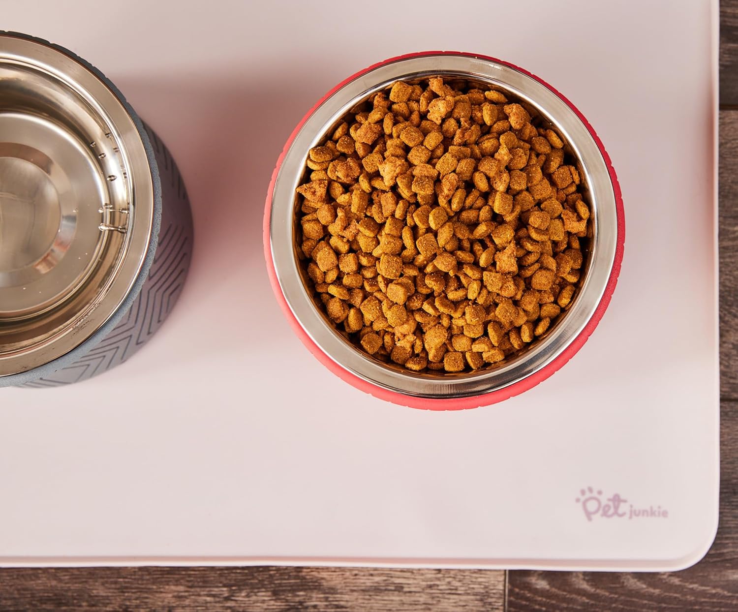 - LARGE AND SMALL PETS: 22" x 14" x 0.33" - This dog food placemat fits two Pet Junkie bowl stands or comparably sized pet dishes. Perfect size for a food mat for dogs or a cat feeding mat.