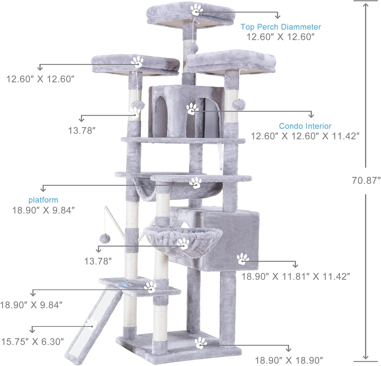 - It's tall but easy to climb: This large cat tree is 71 inches high, suitable for kitties who like to stay in high position, big cats or multiple kittens. Thanks to the idea design on structural, cats in difference sizes can climb up and down on the activity centre as much as they want