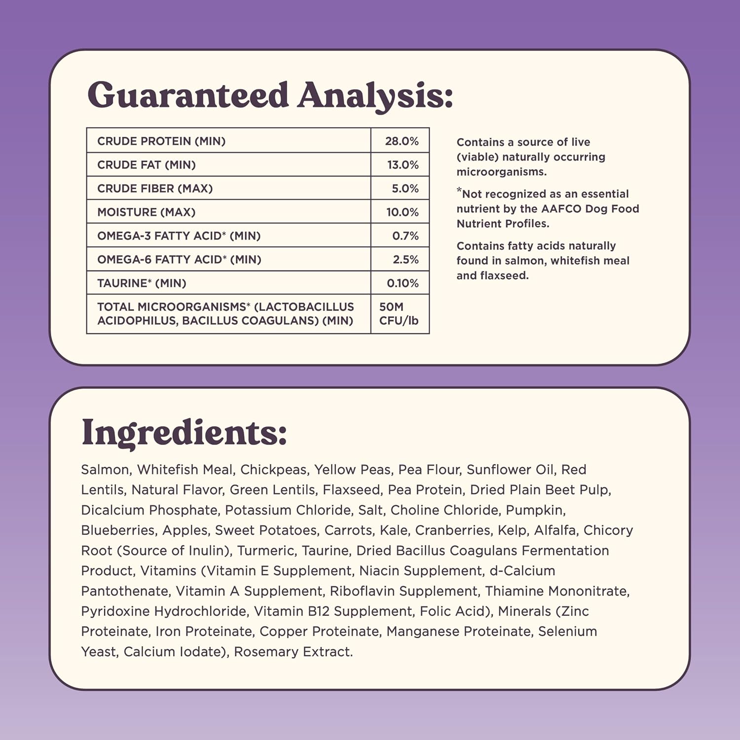 - REAL SALMON DRY DOG FOOD: Made with real salmon as the first ingredient our Vibrant dry dog food recipe is a natural and healthy dog food with added probiotics for sensitive stomachs.
