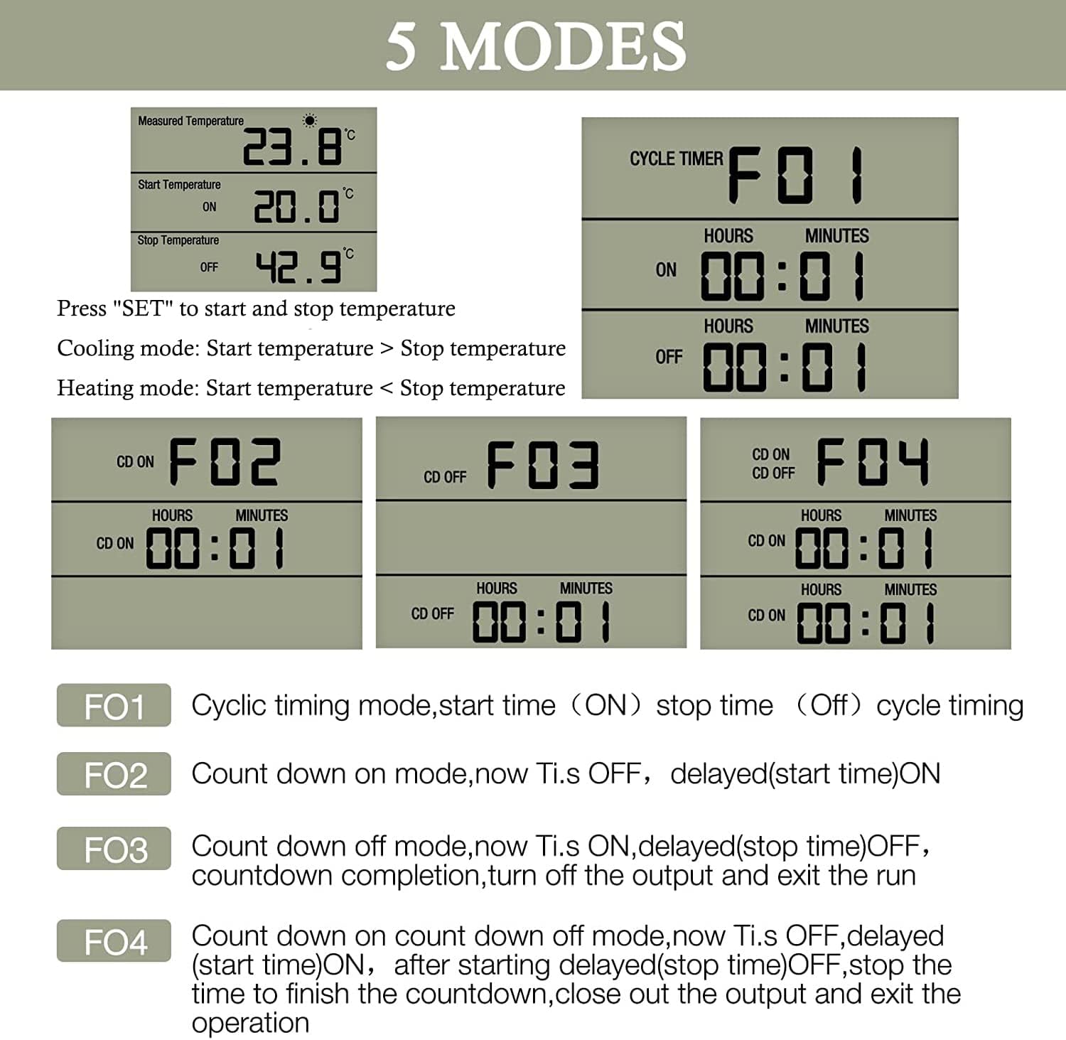 - MODE SELECTION : 5 modes to choose from, F01 cycle timing control mode, F02 countdown on mode, F03 countdown off mode, and F04 timing switching mode. Timing range: 0-99 hours 59 minutes. Timing accuracy: Up to 10 minutes.