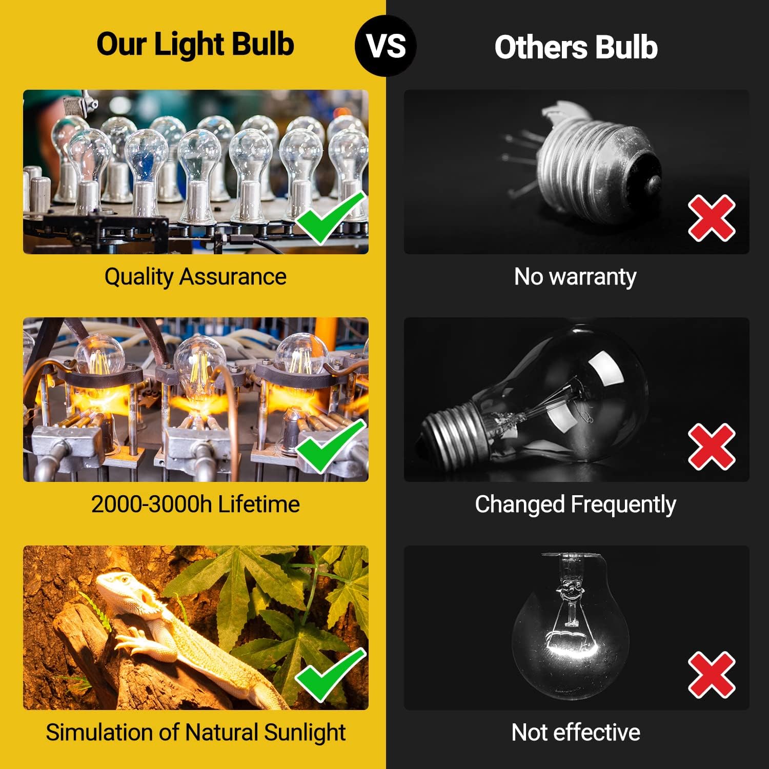 - ăLong Service LifeăAdopt updated vacuum aluminizing process technology, the efficiency of the heat lamp bulb increase by 35% and save more energy. Good quality results from upgraded process and the reptile heat lamp can be used over 2000 hours, max 3000 hours.