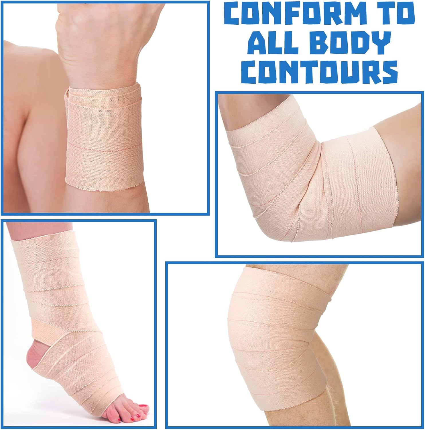- Comfortable and Flexible: elastic adhesive bandage tape is ideal for where elastic pressure dressings are needed, or can be applied for strapping support, fractures, muscle injuries, knees, elbows and shoulders; This is a porous, self adhesive, elastic tape that allows the skin to breathe, ideal for use both indoors and outdoors