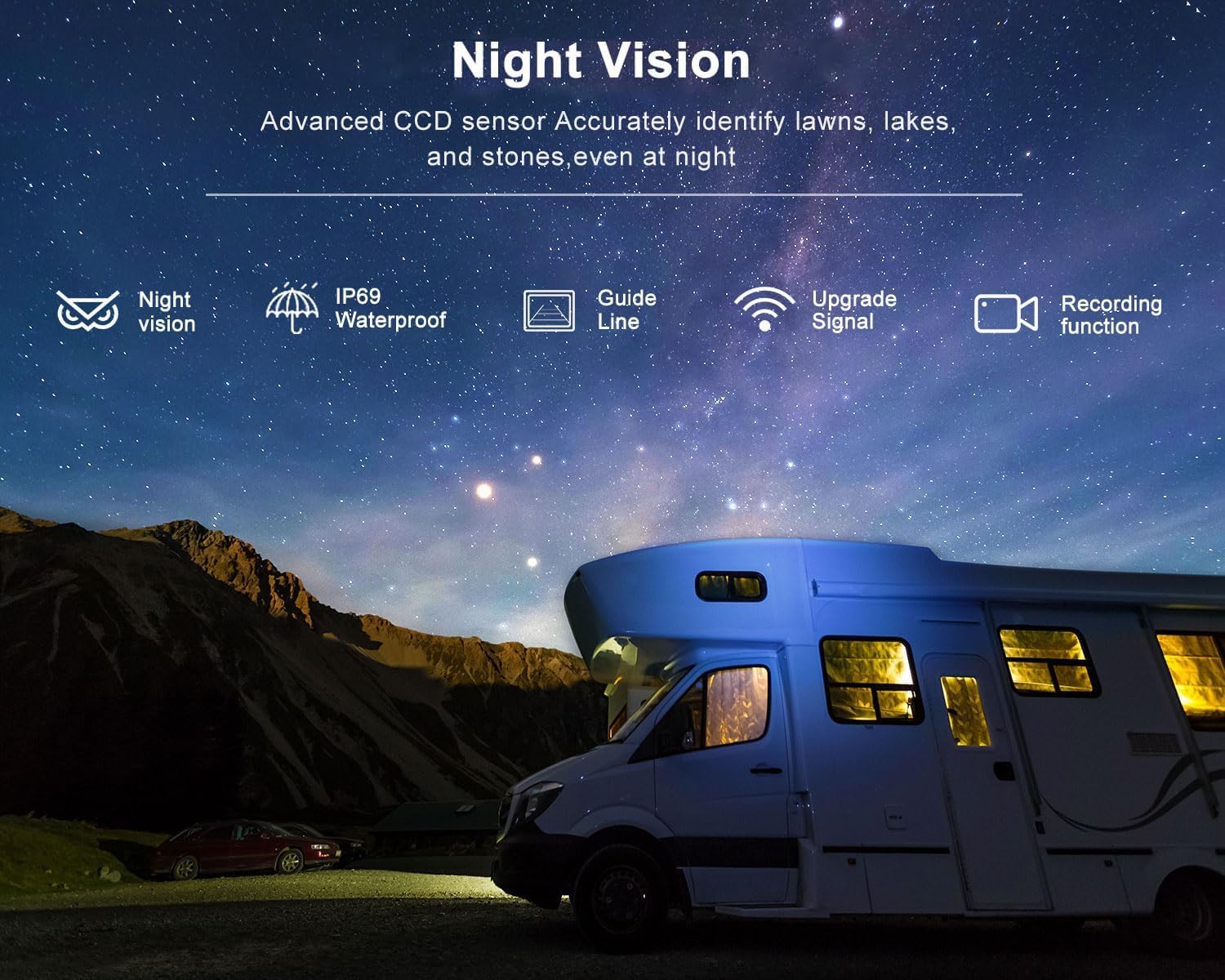 - 【Easy Installation & Wide Application】Wire camera to running light / tail lights/reverse lights to observe, Cigarette Lighter/ACC/Fuse/Radio can power monitor, Just connect power source and install antenna, you can start to use. Accommodate a large variety of vehicle as RV/Camper/Truck/5th Wheel Trailer/Bus/Van/Pickup.