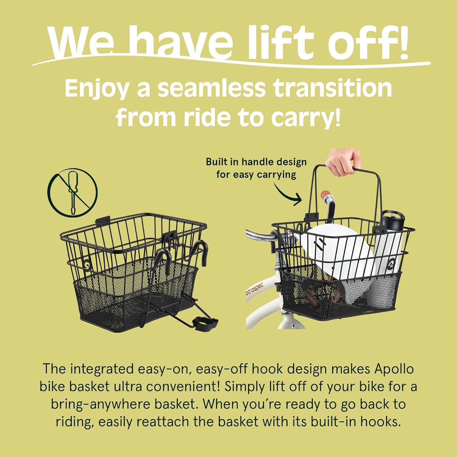 - SNAP ON & GO - This bicycle front basket attaches in seconds without tools, using smart integrated hooks. Pop it on for your morning commute, then detach instantly when you reach your destination