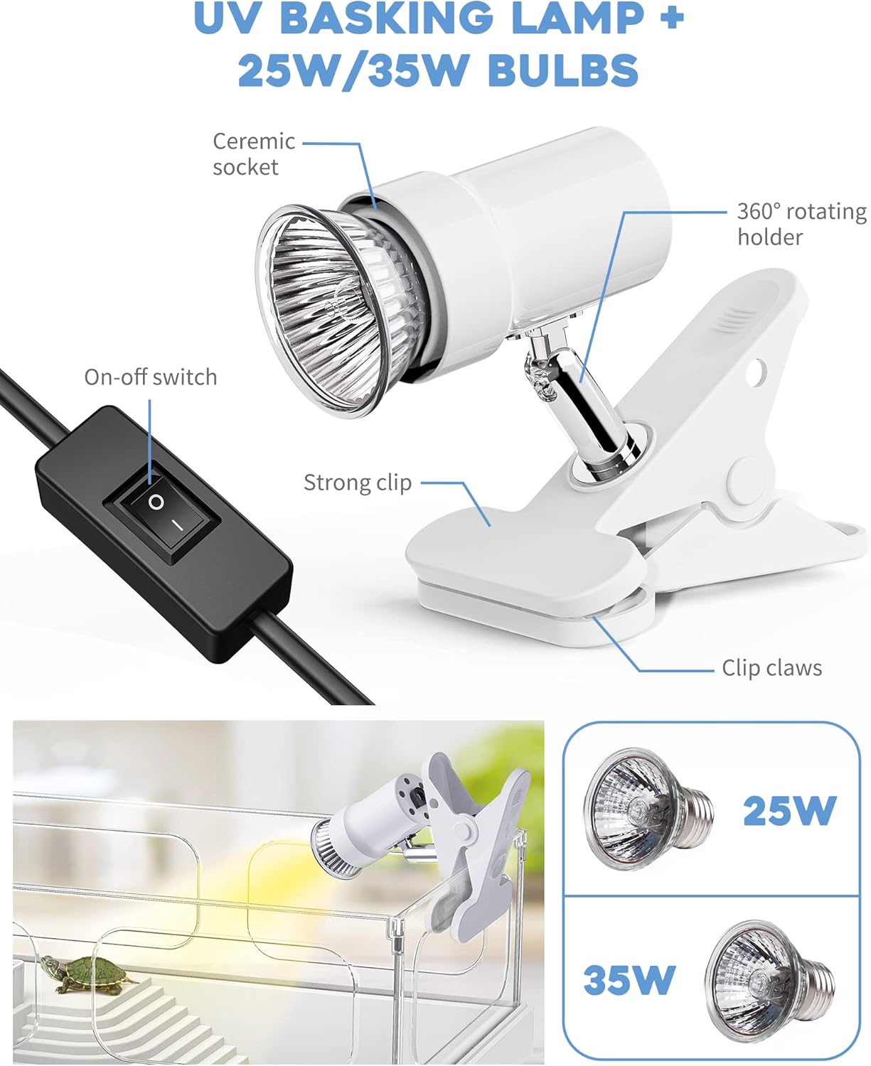 - ăUVA/UVB Basking Lamp + 25W/35W BulbsăTurtles need to bask in the sunshine everyday 1-2 hours for metabolism, mood regulation, breeding, etc. 25W/35W Bulbs provide best warmth within distance of 10ââ to 15ââ. Theyâre perfect for this small tank, not too hot not too cold.