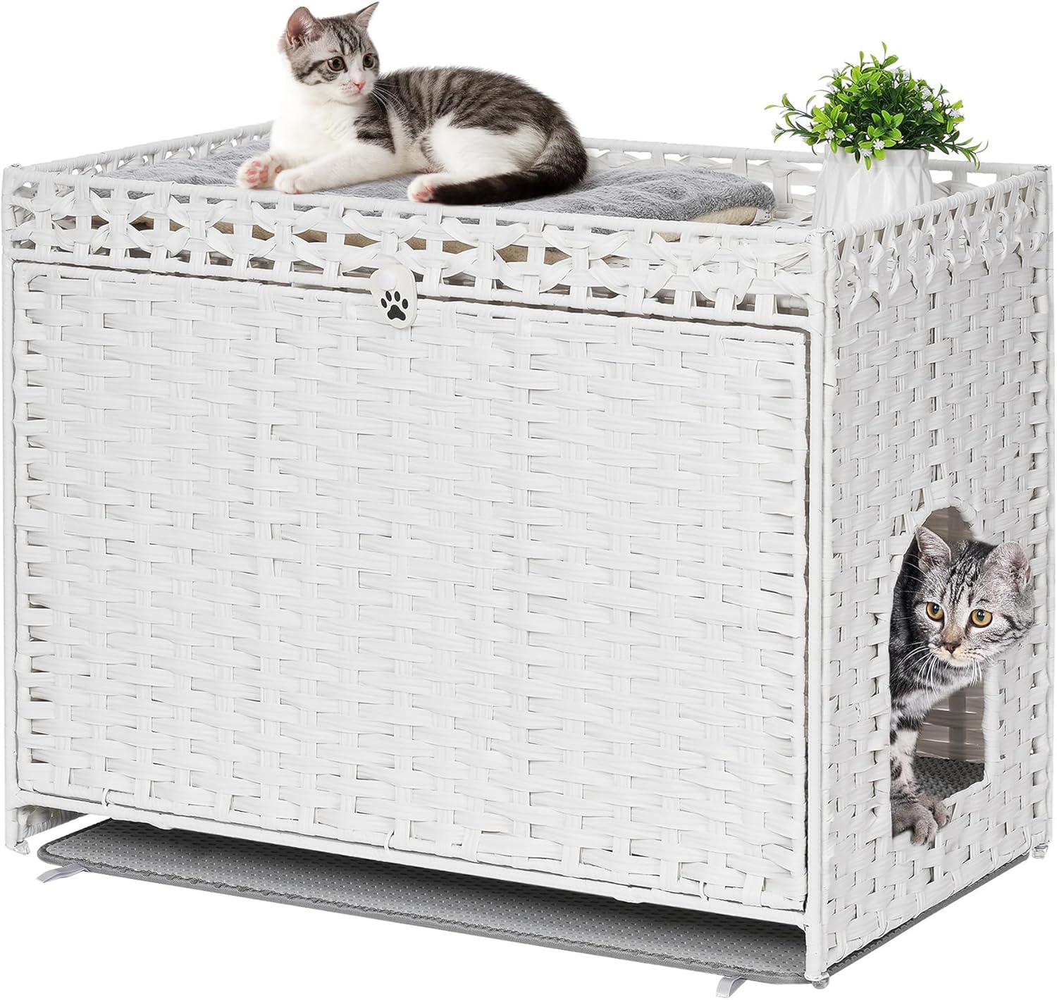 Cat Litter Box Enclosure with Soft Litter Mat; Hidden Cat Washroom Furniture with Door; Handwoven Rattan Cat House with Large Space; Pet Crate for Living Room, Bedroom, Balcony (White)
