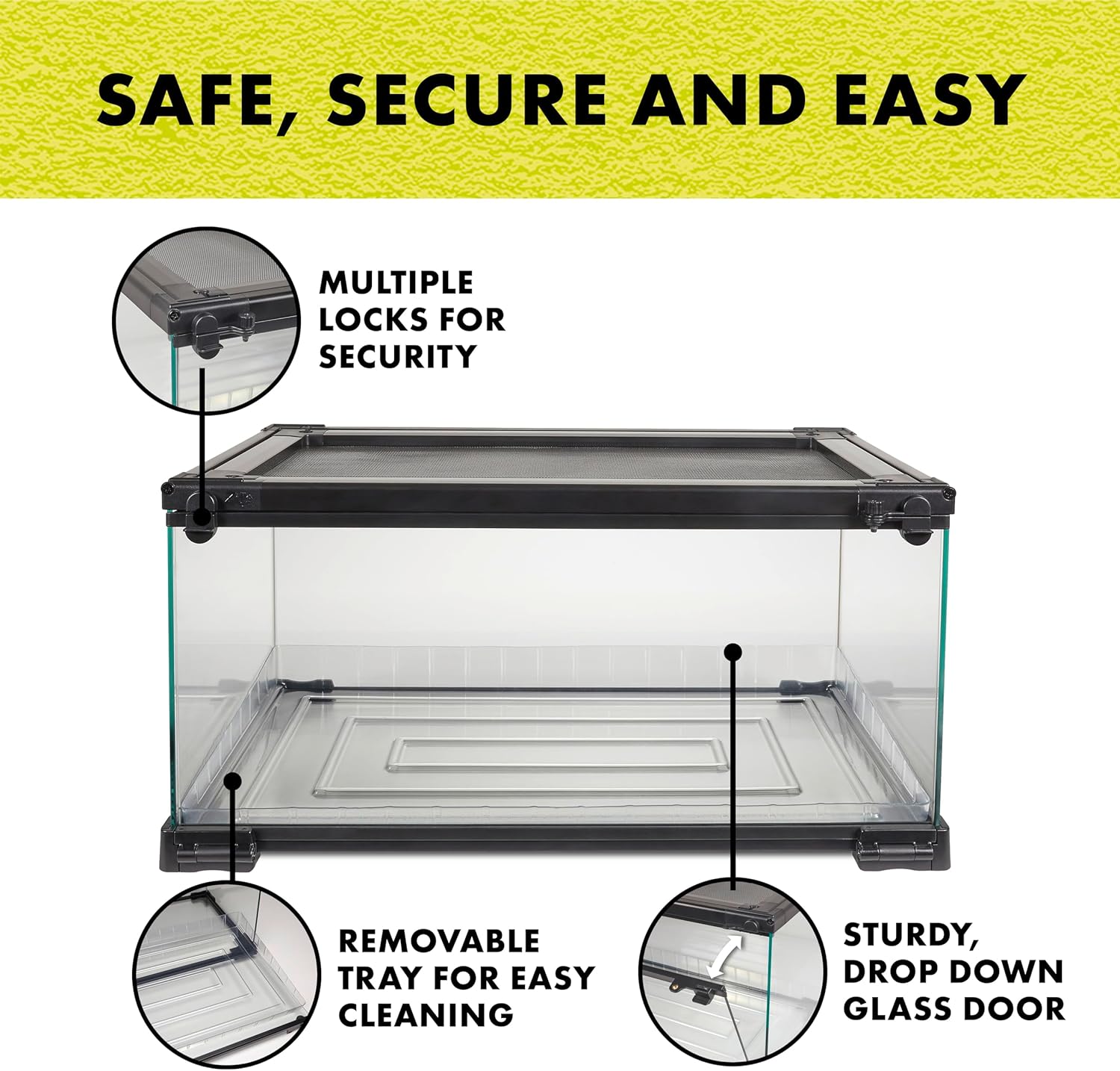 - đŚ SECURE â The feeding port on the top of the terrarium, the top of the terrarium itself, and the sliding front-opening doors lock to keep pets in their home.