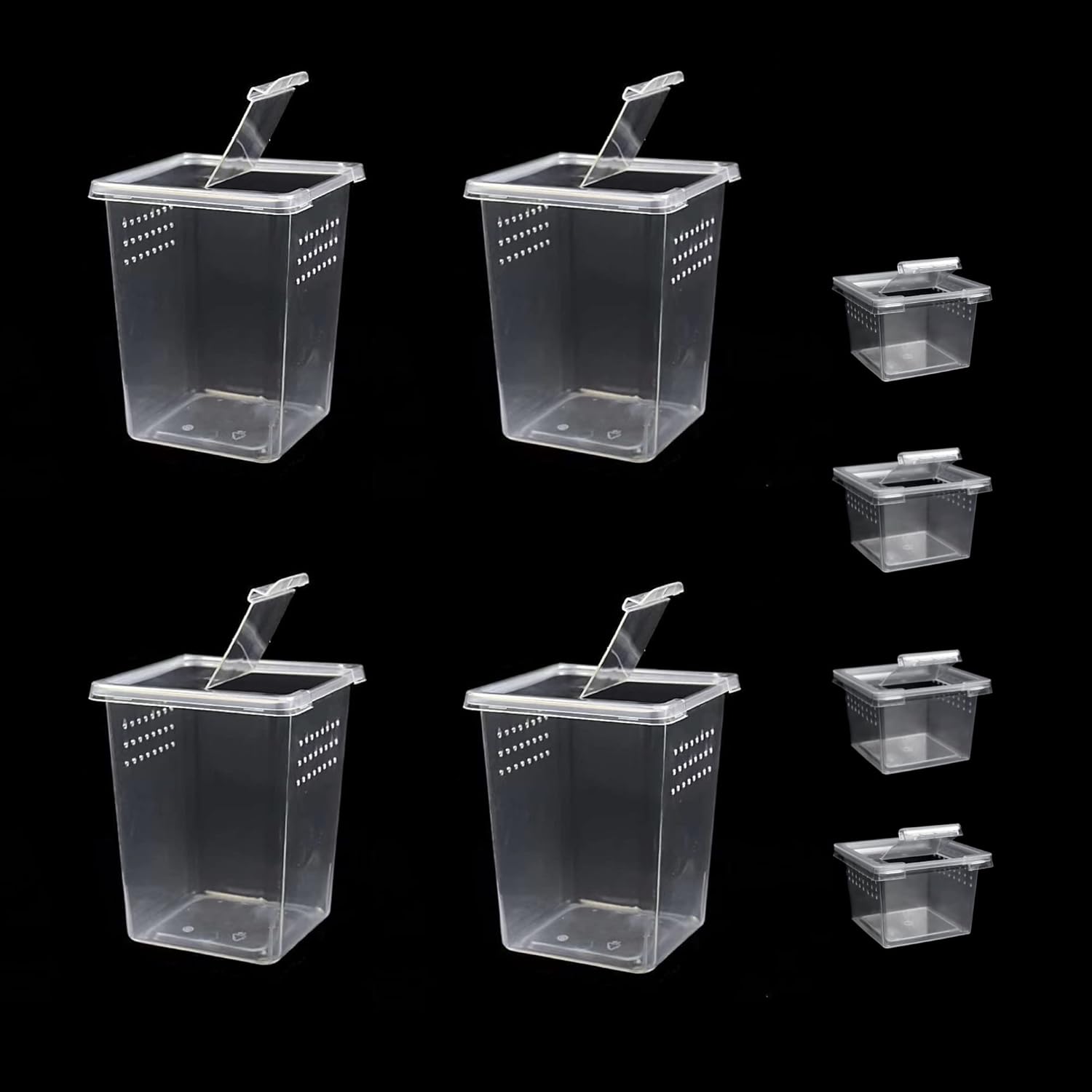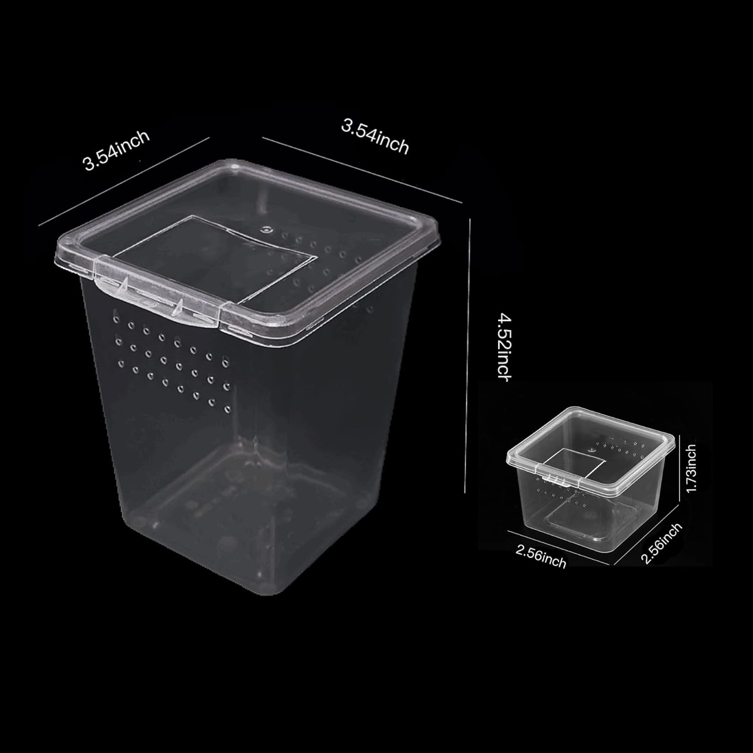 - ăinsect Box Setă: package include 4 pcs high insect terrarium and 4 pcs small breeding box ,high box measure about 3.54"L x 3.54"W x 4.52"H, small box measure about 2.56"L x 2.56"W x 1.73"HďźMade of quality plastic material, good transparency, sturdy , reusable, easy to clean, easy to clean, lightweight and light, suitable for pet incubation, small pet breeding box, temporary feeding or outdoor transportation and carry.