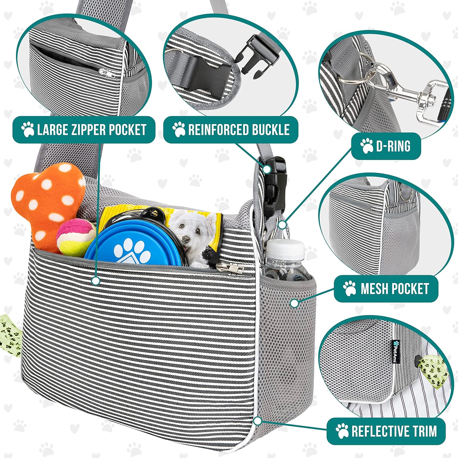 - CROSSBODY PET POUCH PURSE: The dog front carrier comes with a poop bag dispenser feature pocket, a large pocket on the back to store pet stuff, treat, food, toy, and a mesh pocket on the shoulder strap for essential personal items, phone and cards. The strap is adjustable, sturdy and durable, with a reinforced buckle and D-ring on the side for safety and convenience. This cute cat sling carrier chest is easy to wear and carry. Ideal for hands free situation just like puppy back pack and bookbag.