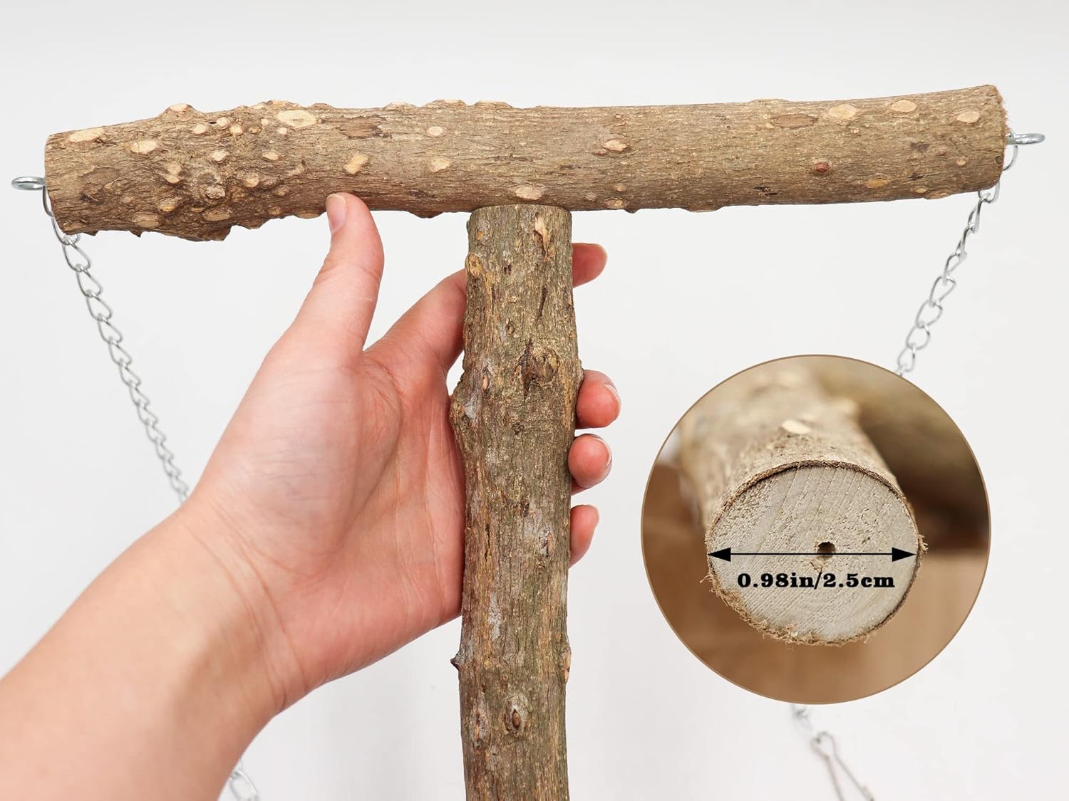 - 【Natural material】: The bird swing toy is made of wear-resistant and bite-resistant natural pepperwood, which is suitable for the bird's daily biting and beaking. The pepper wood is connected by pre-embedded bolts and nuts. The top chain and hook are made of stainless steel, which are durable and not easy to rust.