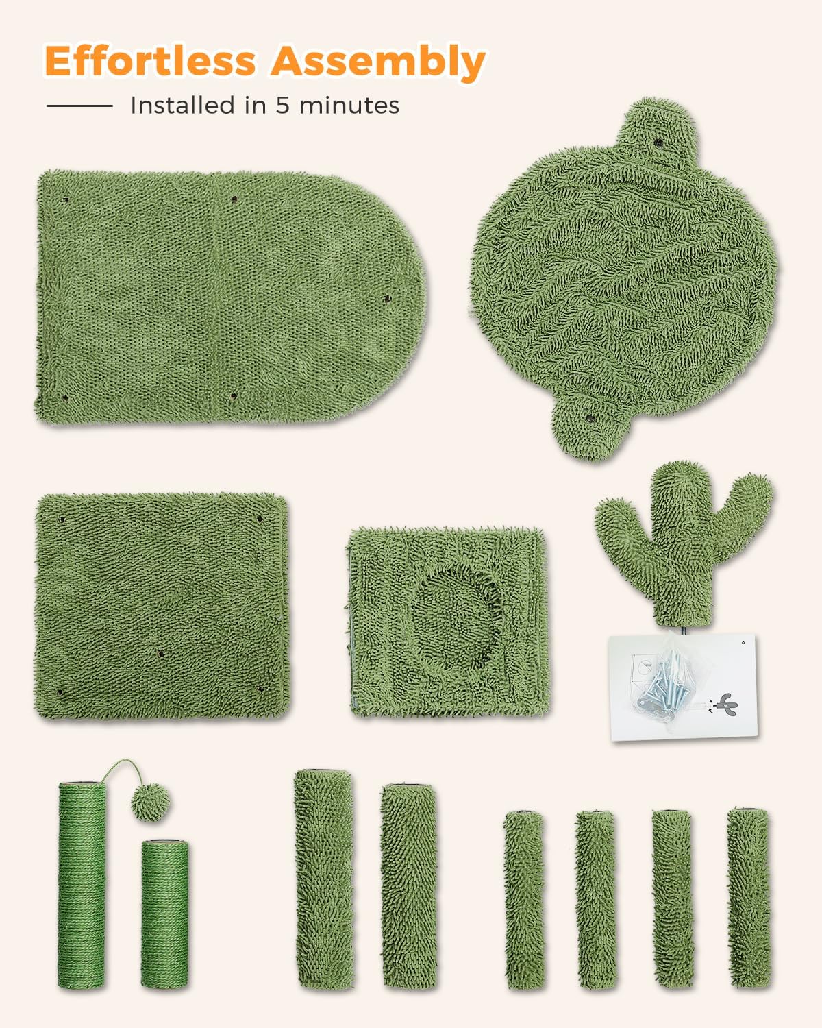 - Quality Construction: The MUTTROS Cactus Cat Tree is built to last, with sturdy materials and expert craftsmanship. It can accommodate multiple cats and is designed to withstand even the most active play. Easy Assembly: Setting up your cat's new playground is a breeze. The clear instructions and included tools make assembly quick and hassle-free.