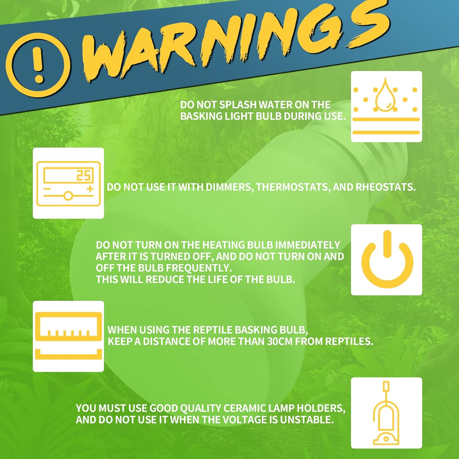 - đŚSafety Instructions - You must use good quality ceramic lamp holders, and do not use it when the voltage is unstable. Do not use it with dimmers, thermostats, and rheostats. Do not splash water on the basking light bulb during use. When using the reptile basking bulb, keep a distance of more than 30cm from reptiles. Do not turn on the heat bulb immediately after turning it off, and do not turn the bulb on and off frequently.