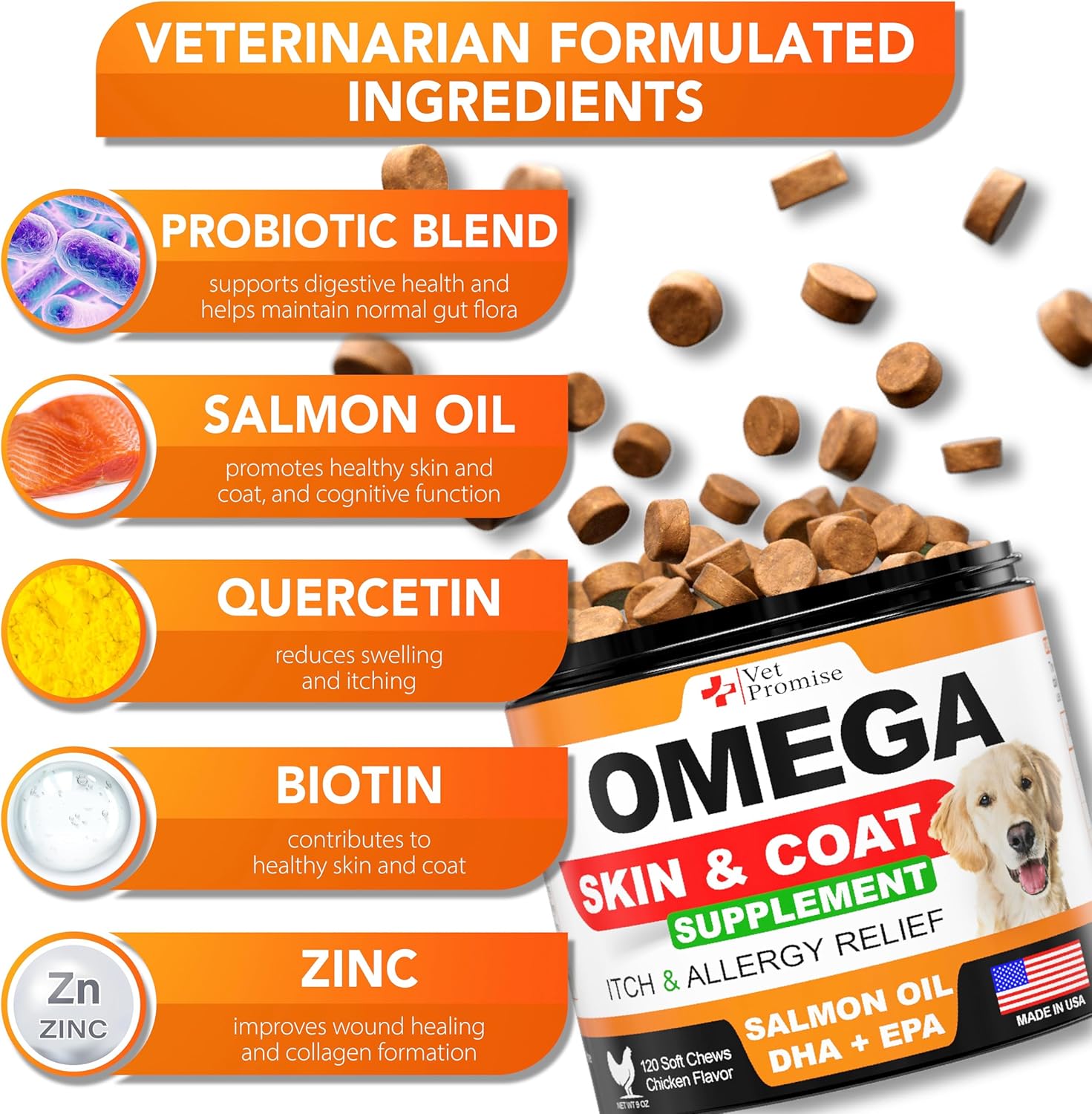 Omega 3 for Dogs - Skin and Coat Supplement - Fish Oil for Dogs Chews - Allergy and Itch Relief - Anti Shedding Supplement - Dry Skin Treatment - Salmon Oil - Made in USA - 120 Soft Treats