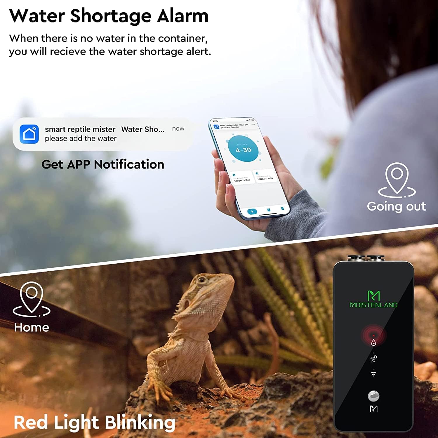 - Moistenland wifi reptile mister allows you to set the misting frequency and duration of each misting session. You can set up custom misting schedules based on the needs of your reptiles and the ambient temperature and humidity of your environment.