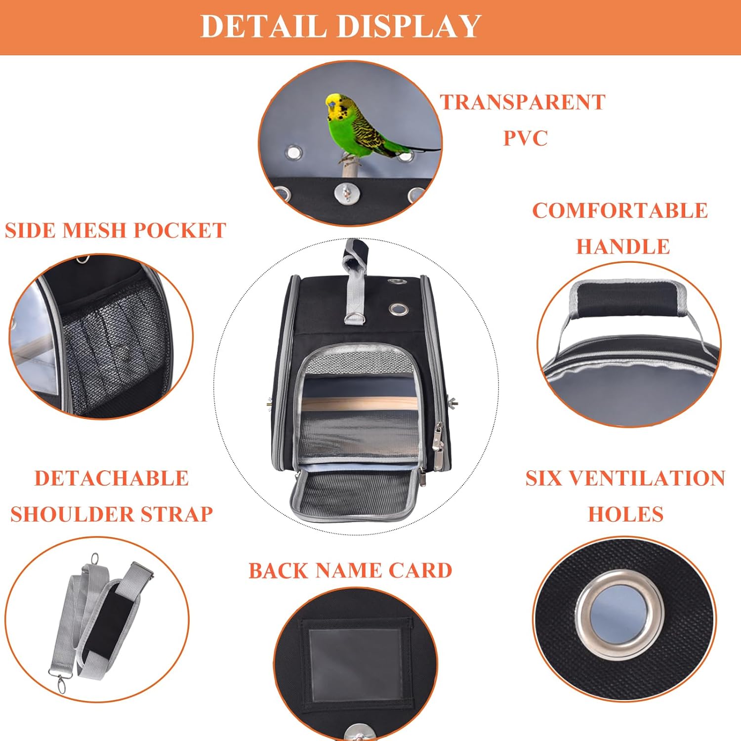 - 1.Big Transparent Window: There is a large transparent window made of PVC in the front of the bird carrier bag. This clear window allows small pets to see the scenery outside during their travels, and you can keep an eye on your pets at all times