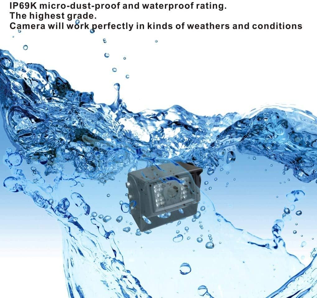 - [HEAVY DUTY CAMERA] It is a color AHD 1080P camera. It provides clear and color image, and no delay. The viewing angle is 120 degree. With waterproof rating IP69K(the highest level) and night vision, it works perfectly in kinds of weathers and low ambient light. With heavy duty 10G vibration-proof rating, it works well with the vehicle which has intensive vibration in extreme conditions.