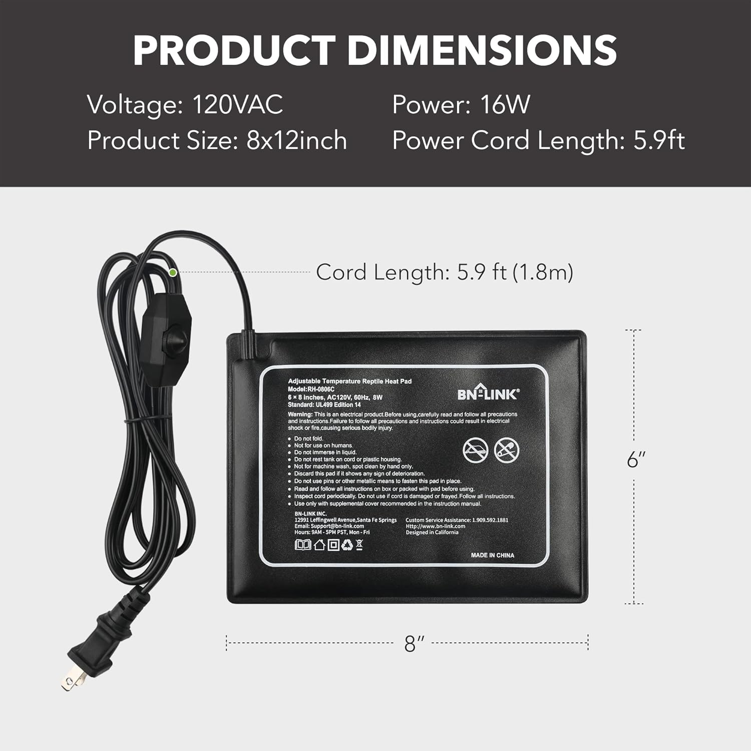 - MADE FOR REPTILES: Voltage: 120 volt, Power: 8 watt. The 6" x 8" with adjustable knob model is perfect for a 10 -20 gallon terrarium and it can easily put out steady heat between 104â and 122â. Each unit comes with BN-LINKâs strong 15-month warranty.