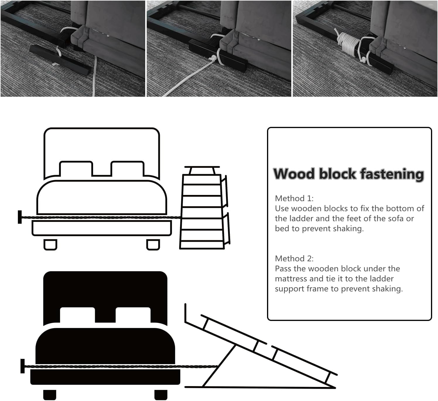 - SAFETY DESIGN: This pet ramp is designed with your pet's safety in mind: equipped with 3 removable safety side rails on the side to better guide and protect your lovely pet. The wooden blocks and ropes in the accessories are used to secure the bottom of the ladder and the feet of the sofa or bed to make the pet ramp more stable. The pet bed ramp can hold up to 110 lbs.