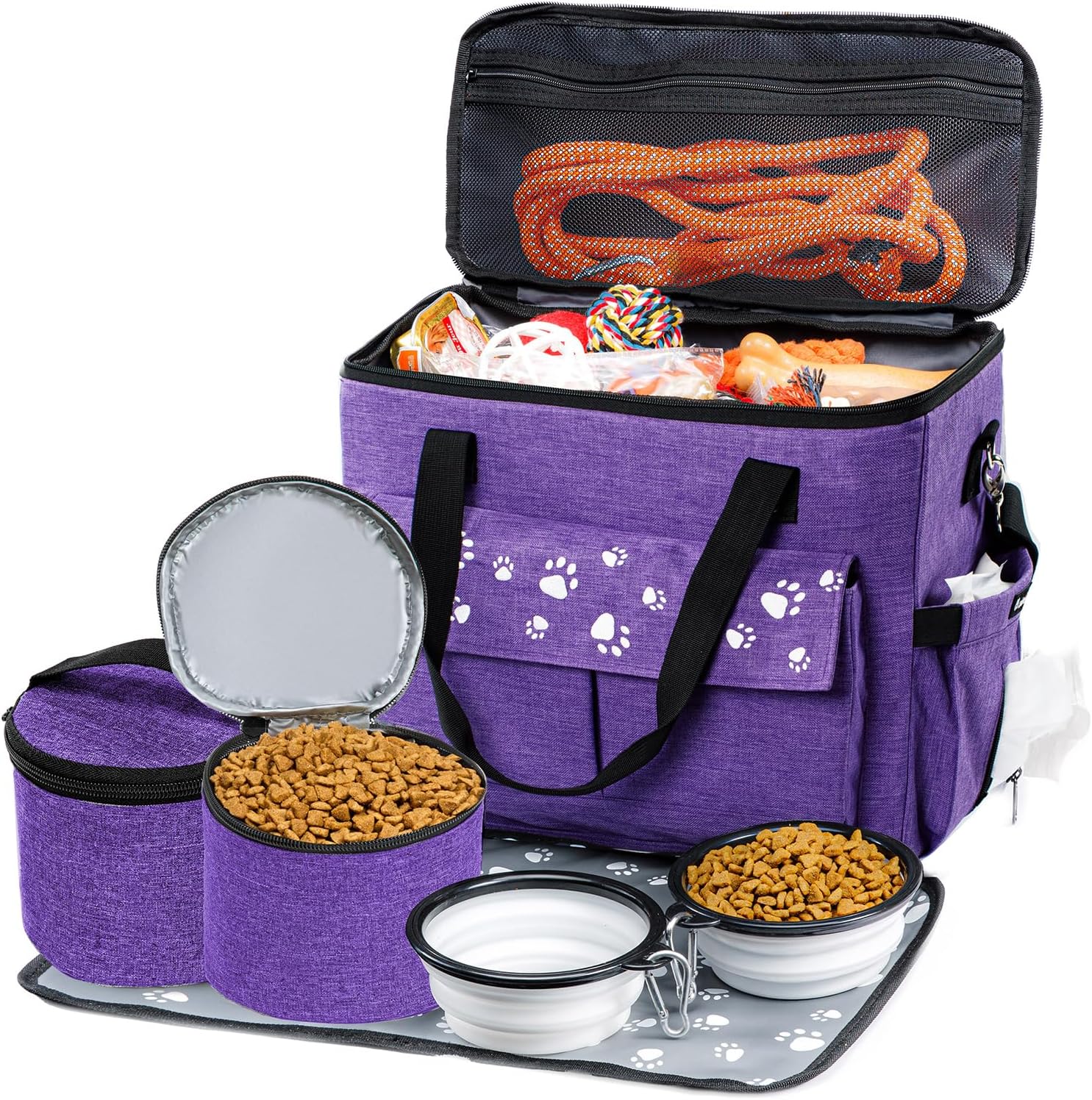 - đPet Travel Bag Set Come Includes - 1 XL Dog Travel Bag, 1 Water-Resistant Placemat, 2 Travel Dog Food Bags Containers (PEVA lining easy to wipe clean), 2 Silicone Collapsible Travel Dog Bowls, 1 Removable Shoulder Strap! Makes the perfect dog weekend travel bag.