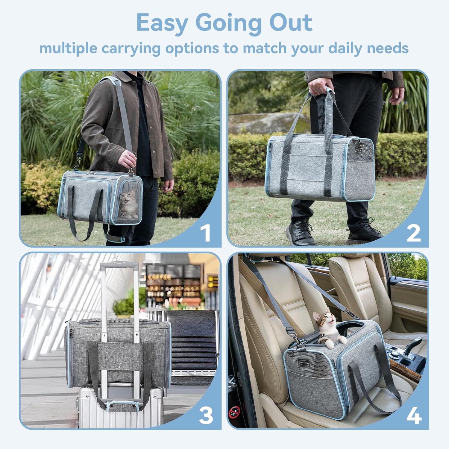 - 【Comfortable Space】 Expandable cat carrier enables pets to sprawl out, lay, see all around and relax when you have a flight trip, also works great in the car, roomy and they lay in it like a bed. The airline cat carrier can be folded totally flat when not in us.